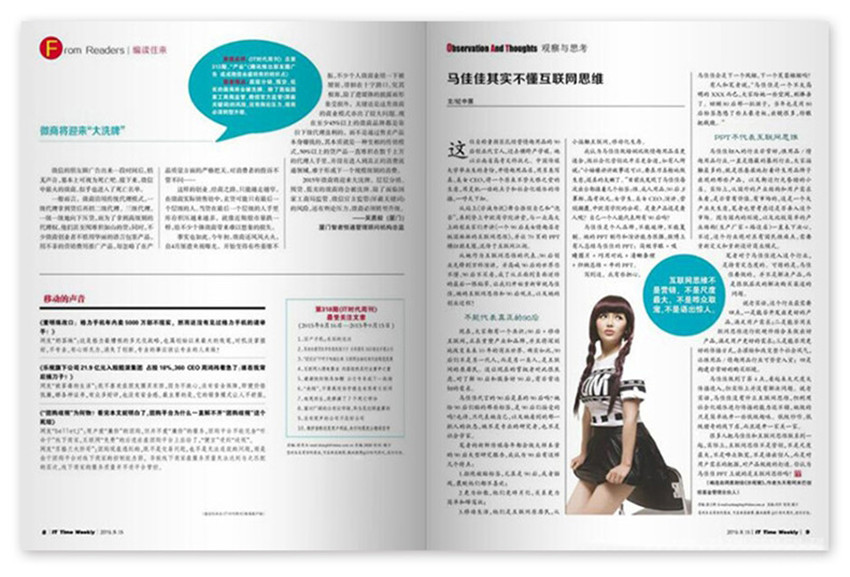 雜志從創(chuàng)刊以來,一直在不停地創(chuàng)新,目的只有一個--滿足讀者的需求。幾年來發(fā)行量飛速上升,可我們還是感到有一種危機(jī)在時時威脅著我們:科技的進(jìn)步,互聯(lián)網(wǎng)的飛速發(fā)展,新媒體不斷的涌現(xiàn)……所以,我們只有一步不停地創(chuàng)新自己。