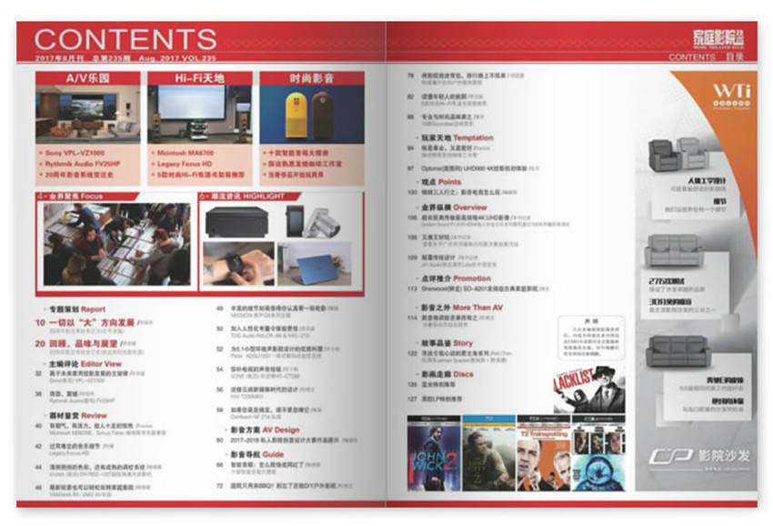 《家庭影院技術》主要欄目:家用3D平板電視攻略、讓聲音更加美妙與精彩、入耳式耳機綜合測評、器材鑒賞\家庭影院音箱應用指南、享受屬于個人的影音、等。