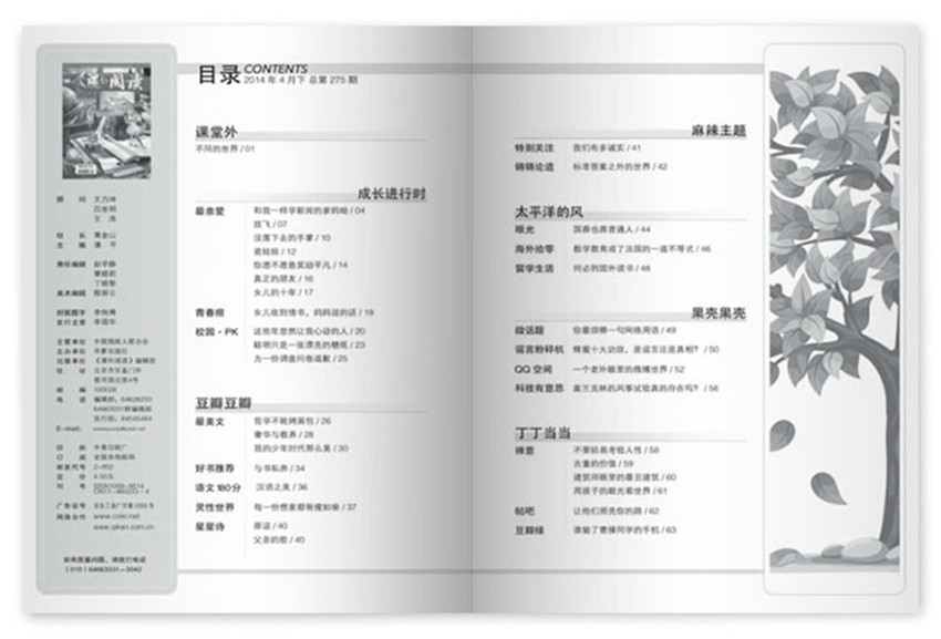 《課外閱讀》,創刊于2002年,期望通過自身在傳播領域的資源優勢,給我們帶來高品質生活,紙張開本:16開,國內刊號:CN:11-4602/G4。 《課外閱讀》是一本適合小學高年級和初中低年級學生閱讀的一本純閱讀期刊,里面的故事生動有趣,引人入勝;插圖盡管不是那么的色彩艷麗,卻別有一番風味,簡單而不失精致。期刊里的文章也不乏許地山、莫言、梁曉聲、余秋雨等一些文學大師的作品,讓我們的讀者足不出戶就能納百家之言,知利己之識,長益己之志。