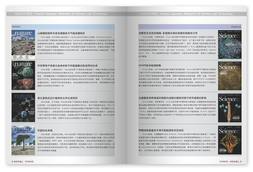 《科學(xué)中國人》主要欄目:中國人口老齡化問題、國際權(quán)威刊物關(guān)注、歐盟加強(qiáng)光予技術(shù)創(chuàng)新等。