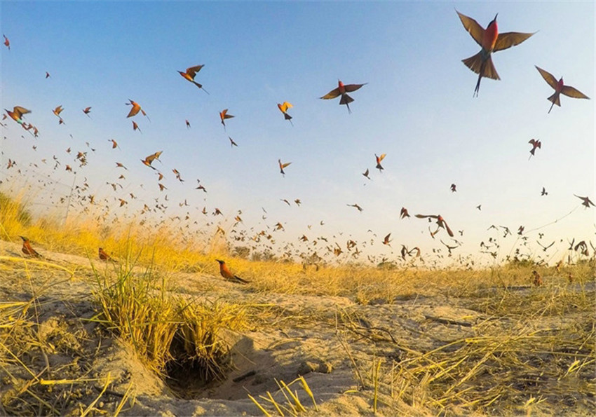 在納米比亞的贊比西河,無以計數的深紅色的食蜂鳥(南紅蜂虎)沖上藍天。你來掌鏡攝影師JasonBoswell說:“”當時一組人正想為幾百只食蜂鳥做標記,以了解它們離開這片土壤后去了哪里。為了躲避人群,鳥兒紛紛起飛,所以才有了這一幕。”今天是美國國家愛鳥節,這個節日正好碰上一個由市民為了觀察統計國內鳥類健康狀況而發起的項目——圣誕節鳥類數量統計。