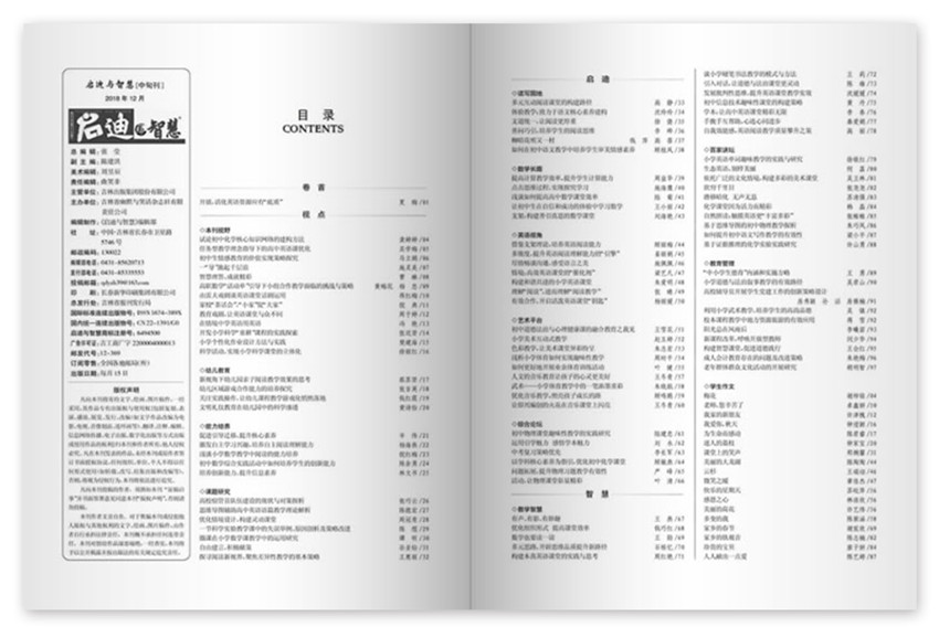 《啟迪與智慧》主要欄目:本刊視野、心理健康、能力培養(yǎng)、課題研究、閱讀與寫作、外語教學(xué)、數(shù)理化園地、政史地、教育藝術(shù)、教學(xué)智慧、學(xué)習(xí)策略、課堂感悟、管理技巧。