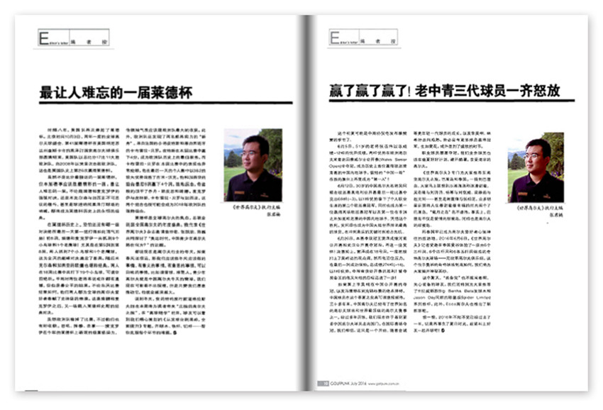 為匯豐冠軍賽、BMW大師賽、CLPGA官方合作媒體,雜志曾主辦了“球場評選”、“世界高爾夫E俱樂部”、“大上海巡回賽”等廣受球友好評的活動。主要欄目:哥倫比亞高爾夫探索之旅,足下旋風,硬漢征服者,高博會的TEE架高。