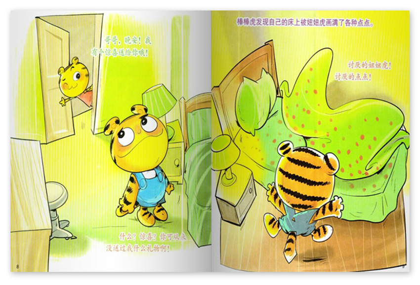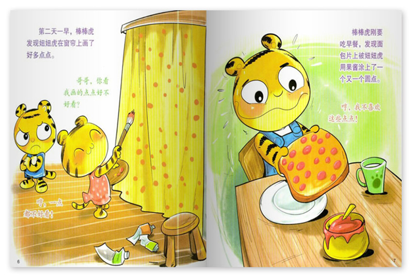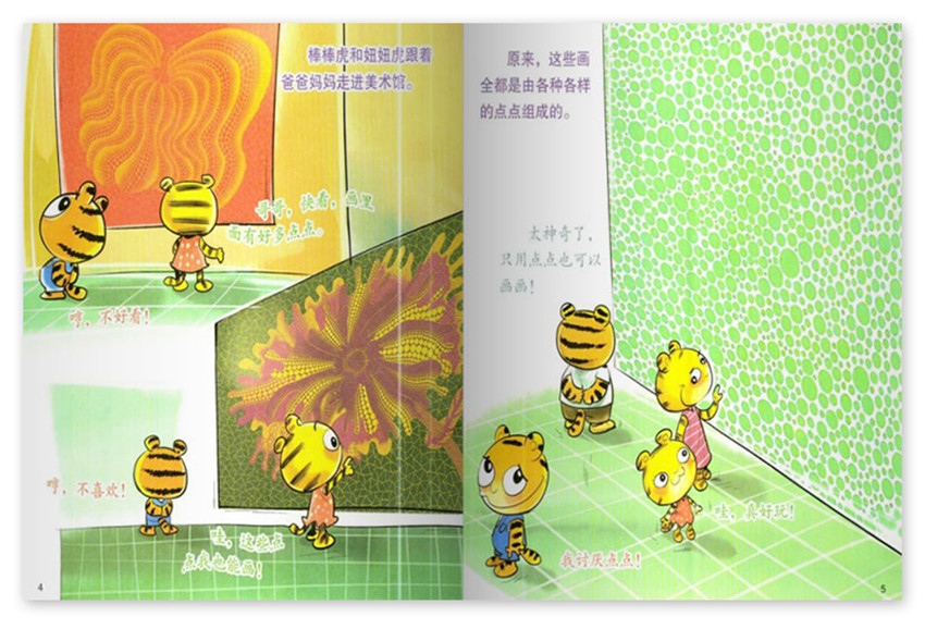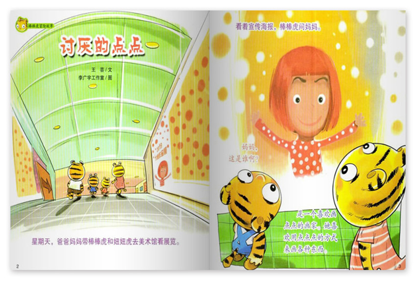獨特的敘述風格,文字力求生動簡潔而饒有興趣,強調與讀者的交流,具有濃厚的文人氣息和知識分子情調。討厭的點點,星期天,爸爸媽媽帶棒棒虎和妞妞虎去美術館看展覽,是一個喜歡畫點點的作家,喜歡用點點點的方式來畫各種東西,原來,這些畫全都是由各種各樣的點點組成的,棒棒虎剛要吃早餐,發現面包片上被妞妞虎用果醬涂上了一個又一個圓點。