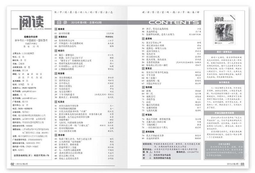 《閱讀》創(chuàng)辦于2005年,單期80頁,《閱讀》雜志是由新校園雜志社出版,苦情雜志,性格雜志,內(nèi)容涵蓋文學(xué)、經(jīng)濟(jì)、歷史、哲學(xué)等方面,引導(dǎo)讀者“閱苦中情,讀情中人”。
