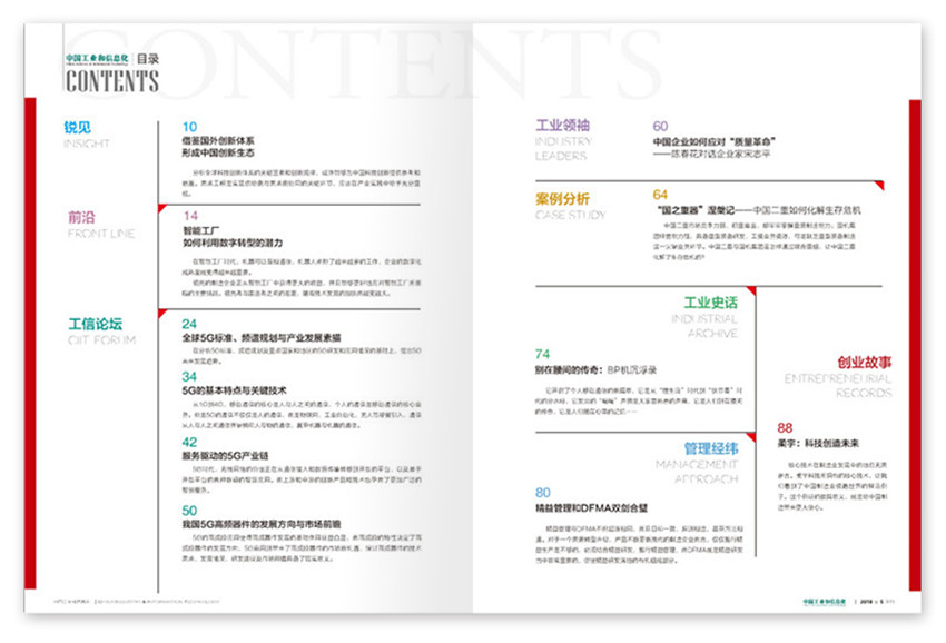《中國工業和信息化》主要欄目:工經論壇、工業領袖、視野、前沿、管理經緯、專題研究等。