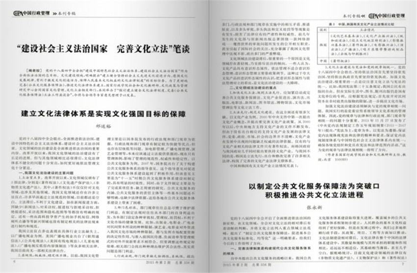 建設社會主義法治國家、完善文化立法”筆談,黨的十八屆四中全會把“建設中國特色社會主義法治體系,建設社會主義法治國家”作為依法治國的總目標。文化建設領(lǐng)域,明確提出“建立健全堅持社會主義先進文化前進方向、遵循文化發(fā)展規(guī)律、有利于激發(fā)文化創(chuàng)造活力、保障人民基本文化權(quán)益的文化法律制度”的目標任務。為了更好地完善《公共文化服務保障法》,推進文化法律體系建立,國家行政學院社會和文化教研部、文化政策與管理研究中心會同國家文化管理、文化立法相關(guān)部門,共同舉辦了“探討建立健全文化法律制度。