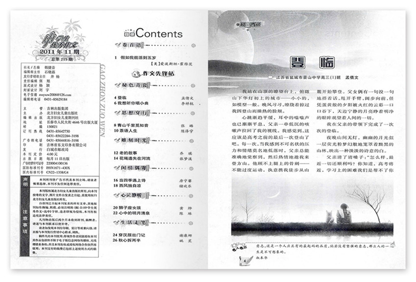 提倡“說真話,做真人”為辦刊宗旨,故深受中學師生歡迎,主要欄目:金素材、時文素材、名校作文、作文講堂、在路上、作文素材實戰點擊、滿分作文讀解、新格言等。